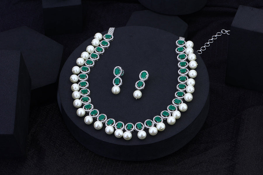 Emerald Diamond Neckpiece With Pearl Hangings, Rodium Polish, made of brass base, and gold plating with AAA+ korean crystals.