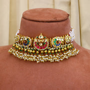 Peacock multicolour jadau Kundan chocker with golden ball and Perl hangings and a pair of jumkha