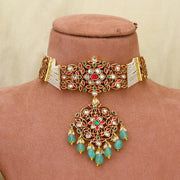 Green and pink Kundan necklace with a pendant hangings and a pair of earrings