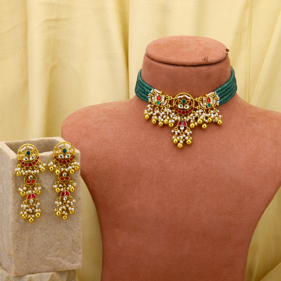 Delicate Red And Green Jadau Lotus Chocker With Green Real Mani In Belt With Earrings