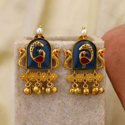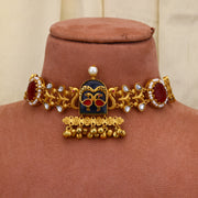 Blue and red stone peacock chocker with Perl attached to it and golden hangings