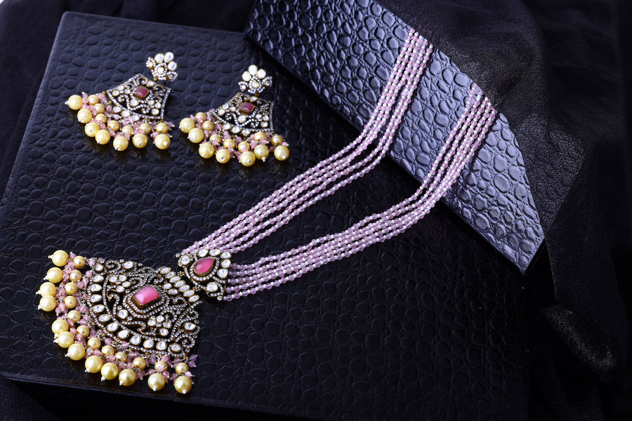 Pink Beaded Moissanite Long Necklace With Pink Stone