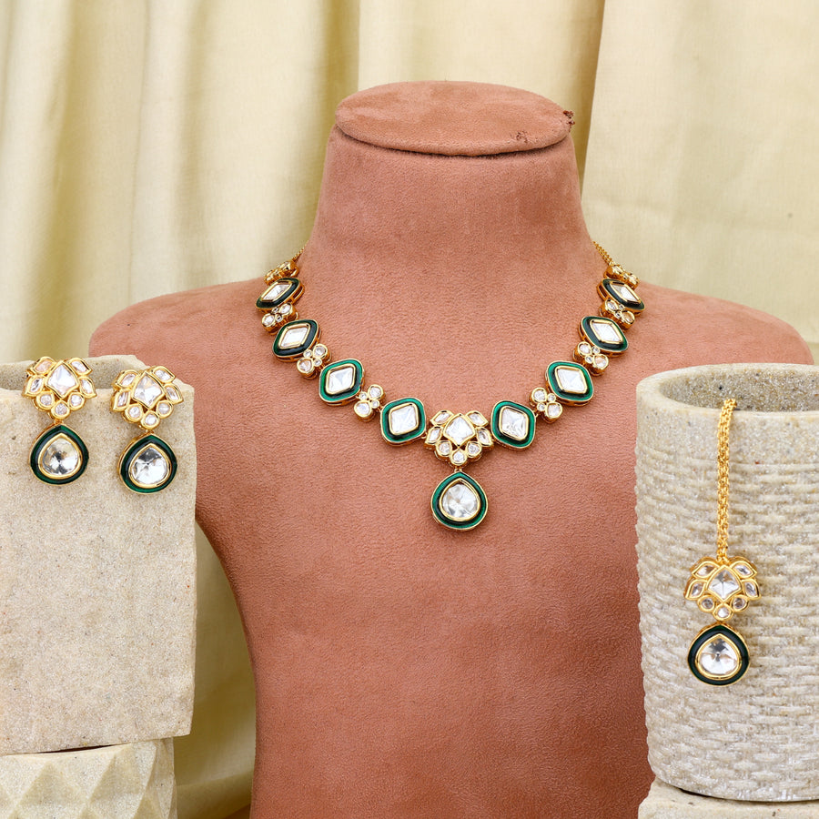 Green minakari uncut polki look moissnaite necklace with a pair of delicate earrings and tika