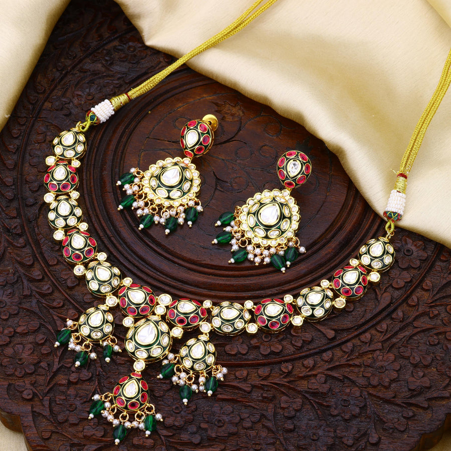 Green and pink moissanite necklace with a pair of bali with green hangings