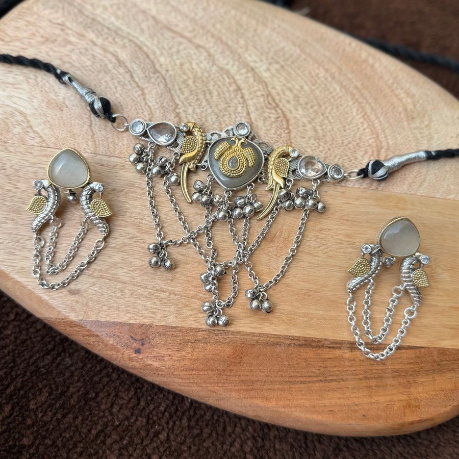 grey stone peacock German silver chocker with a pair of bali