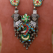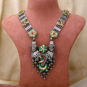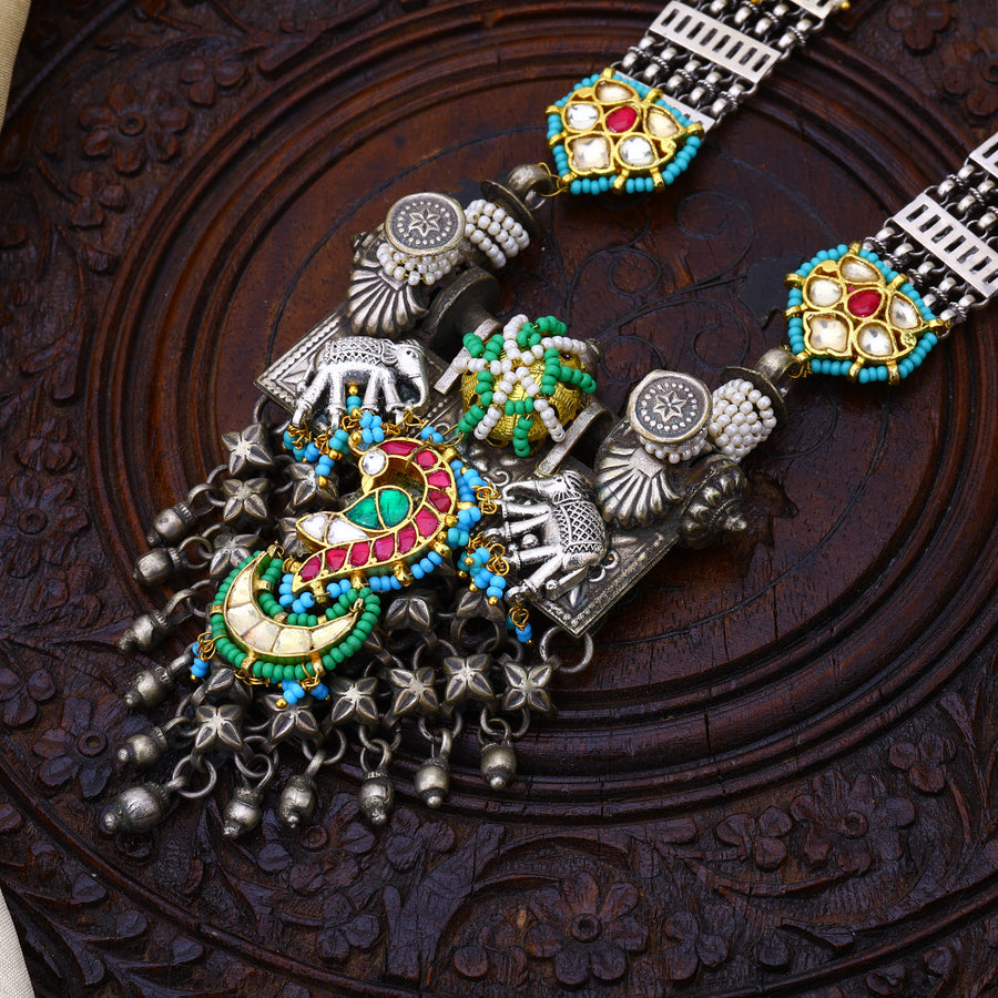 Fusion Statement Long Elephant And Peacock Necklace Made On High Quality German Silver With Jadau Kundan Work On It