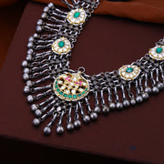 Fusion Green And Pink Jadau And German Silver Silver Look Like Necklace With Silver Ball Hangings