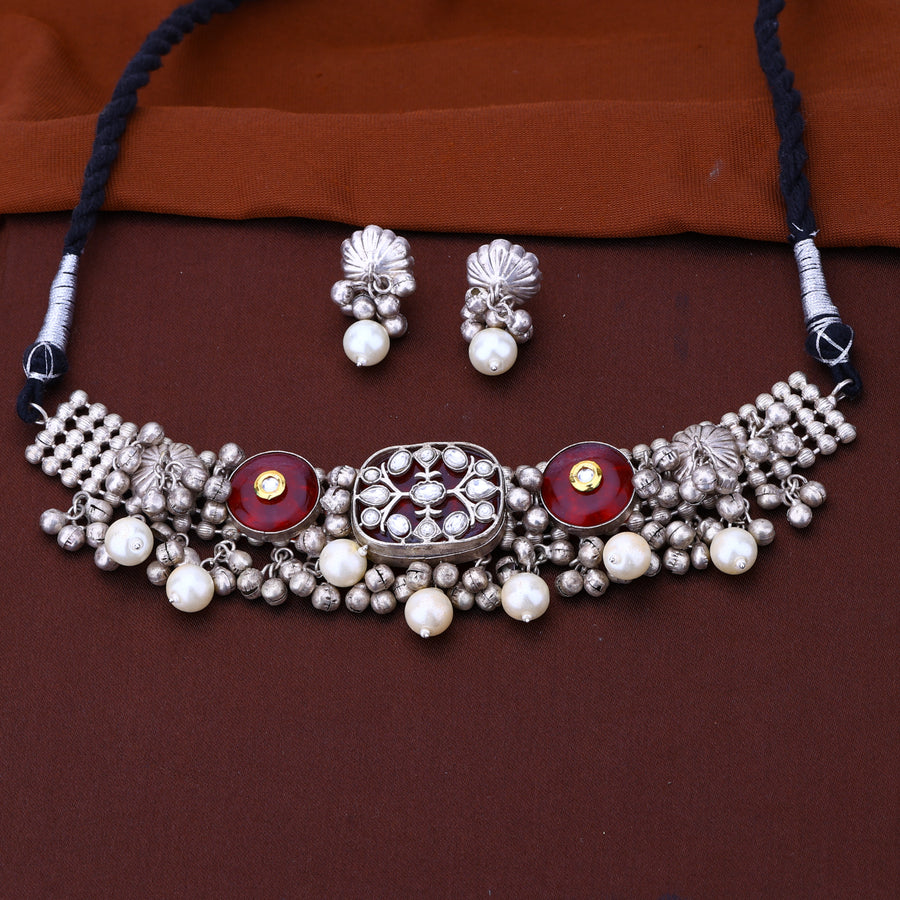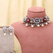 Red Stoned Fusion Necklace With Silver And Perl Hangings